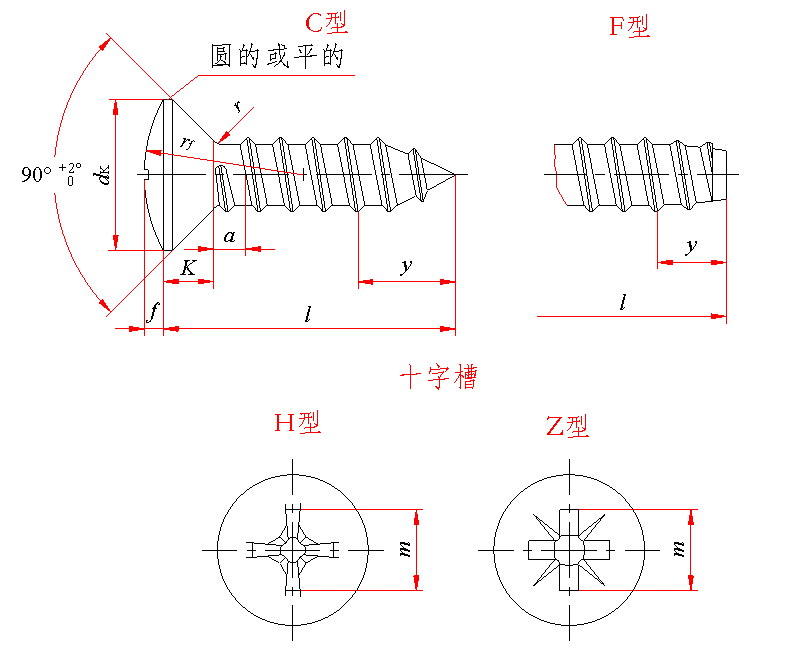 标记示例: 螺纹规格ST3.5、公称长度l=16mm、H型槽、镀锌钝化的C型十字槽半沉头自攻螺钉的标记: 自攻螺钉 GB 847 ST3.5×16 |