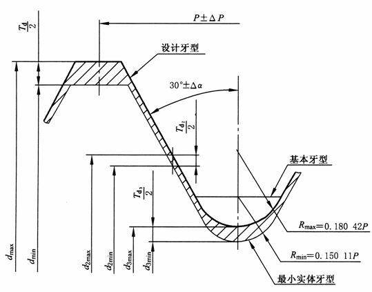 注:外螺纹的设计牙型其牙底为连续、光滑的曲线,曲线上任何地方的圆弧半径不得小于0.150 11P。牙底圆弧半径数值的变化范围见表外螺纹牙底圆弧半径。内螺纹的设计牙型与其基本牙型相同。