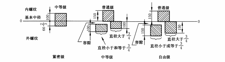 注:图中中等级外螺纹的中径公差大小为100个单位,而其他公差值大小则为其相比于前者公差大小的百分比。 |