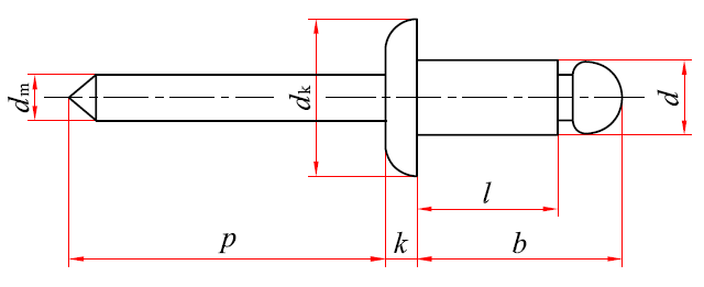 标记示例: 公称直径d=4mm、公称长度l=12mm、钉体由铝合金(AlA)制造、钉芯由钢(St)制造、性能等级为10级的开口型平圆头抽芯铆钉的标记: 抽芯铆钉 GB/T 12618.1 4×12 mm |