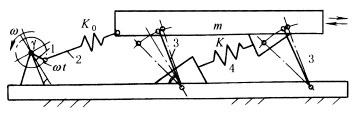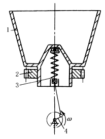 图(1)所示为单质体振动机构,由主动曲柄1通过弹性连杆2带动单质体m(料槽、管或筛)作往复摆动。由于在一次振动循环中摆杆3总是向左倾斜,所以物料向右运动。这种机构可用于物料的输送与筛分。 图(2)中,齿轮2带动1转动,曲柄4通过滑块和弹簧使1产生垂直运动,因而1内的含水粒状物料沿内壁(带孔的钢板)上升,水从孔中分离出来。 |