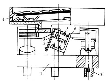 图(3)所示为弹性连杆式螺旋垂直振动输送机。工作构件4为一垂直安装的螺旋形槽体,螺旋槽的下方沿圆周方向安装着倾斜布置的主振弹簧3,弹簧的另一端固定于基础上,槽体4由水平偏心轴1及垂直安装的弹性连杆2驱动,由于在槽体与基础之间装有与主振弹簧相垂直的杆5,因而槽体作垂直与扭转、振动叠加的组合振动。 图(4)中,沿圆周装有4个电磁激振器,每个电磁激振器均呈倾斜安装。由电磁激振器产生的电磁激振力强迫漏斗4及底座1产生垂直振动和绕垂直轴的扭转振动。图中2为板簧、3为衔铁、5为线圈、6为铁芯、7为橡胶减振器。振动频率通常为3000次/min,双振幅为0.5~1.5mm。机器在近共振状态下工作。 |