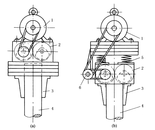 下图a为电动机与激振器连在一起的振动锤。为了防止由于冲击引起电动机损坏,在图b中用弹簧5将电动机1与激振器2隔离。为了预防由于振动引起带的伸长与缩短,在电动机底座上增设一个中间带轮6,中间带轮轴与激振器轴在一个水平平面内。图中3为夹持器,4为冲击锤。 |