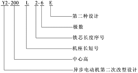 第二种设计满载时有较高效率和节能效果,更适用于长期连续、运行和负载率较高的使用场合,如与水泵、风机配套,此设计称为Y2-E系列。中心高80~280mm,功率0.55~90kW。电动机符合JB/T 8680.2—1998 Y2系列(IP54)三相异步电动机(机座号80~280)技术条件。型号含义:
