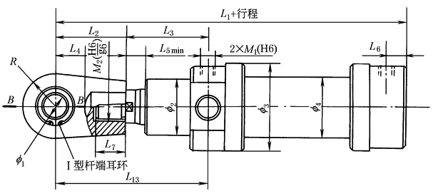 注:Ⅱ型杆端耳环图、B—B断面图、左视图以及其他尺寸代号数值与中部摆动式(ZB)液压缸相同,见表中部摆动式(ZB)液压缸外形尺寸。 |