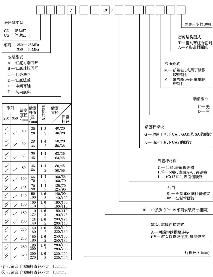 标记示例: 缸径100mm,活塞杆直径70mm,缸后盖球铰耳环安装,额定压力25MPa,行程500mm,缸头、缸底均以螺纹连接,活塞杆螺纹为G型,油口连接为公制管螺 纹,活塞杆材料为45钢表面镀铬,端部无缓冲,液压油介质为矿物油,密封结构为V形密封圈 组的重载液压缸的标记为 CD250B100/70—500A10/02CGUMA |