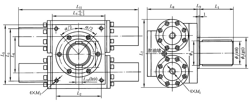 注:1.α为摆动角度,由客户按要求决定(0°~720°范围内,摆角公差α±1°)。如需更高精度或需摆角微调,请在订货时说明。 2.视图上双平键位置表示此位置的双平键轴可向左右各转动二分之一摆角。 |