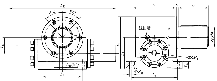 注:1.α为摆动角度,由客户按要求决定(0°~720°范围内,摆角公差α±1°)。如需更高精度或需摆角微调,请在订货时说明。 2.视图上双平键位置表示此位置的双平键轴可向左右各转动二分之一摆角。 |